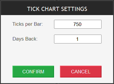 - Ticks Per Bar: Number of ticks before a new candle forms (e.g., 50, 100, 500)