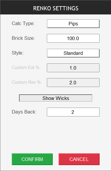 - Custom Extension and Reversal : Price movement in percentage for custom Renko bars