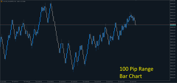 Range Charts create a new bar when the price moves a specified range from the opening price of the current bar. Each bar represents the same price range movement.