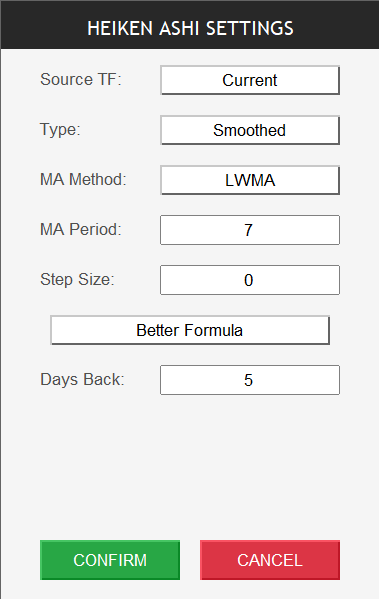 - Better Formula : Toggle to use better formula Heiken Ashi or not