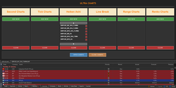 Ultra Charts is a powerful Expert Advisor that transforms your MetaTrader 5 platform by enabling multiple alternative chart types beyond the standard candlestick, bar, and line charts. This tool gives traders access to Second Charts, Tick Charts, Renko, Range, Line Break, and Heiken Ashi charts—all within the familiar MT5 environment.