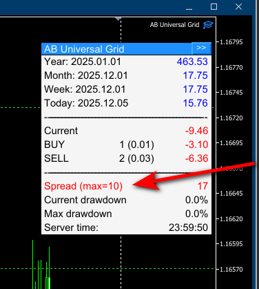 Maximum spread for opening market orders, pips (0=off) – This setting prohibits opening market positions if the symbol spread is equal to or greater than the specified value. This setting does not affect the placement of pending orders. When the info panel is enabled, exceeding this value is displayed as a red line.