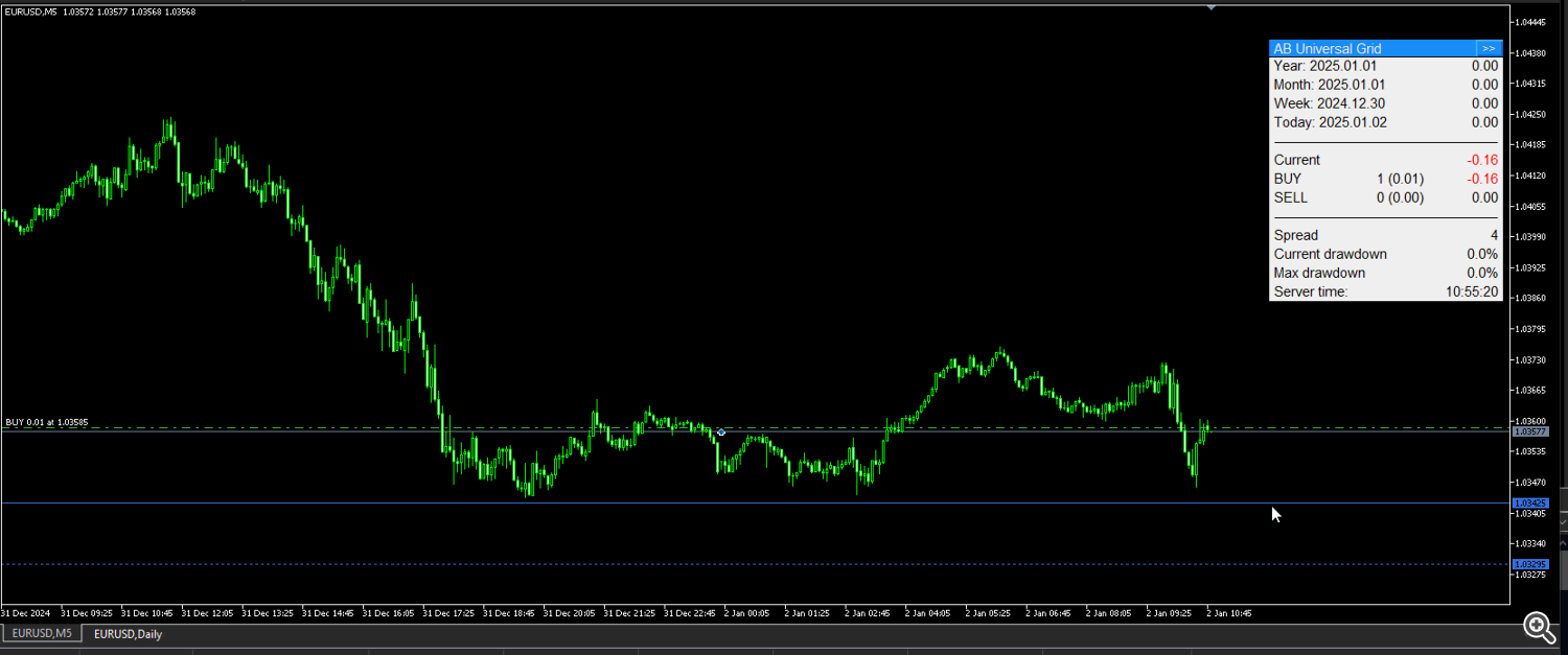 1) Always on the market – A strategy for testing the EA. The signal to open a Buy position is the absence of a Buy position. The same applies to Sell positions. Simply opening a position without any analysis is used to test and study the various algorithms built into the UG EA. Even with this opening, the EA shows profit and good survivability.