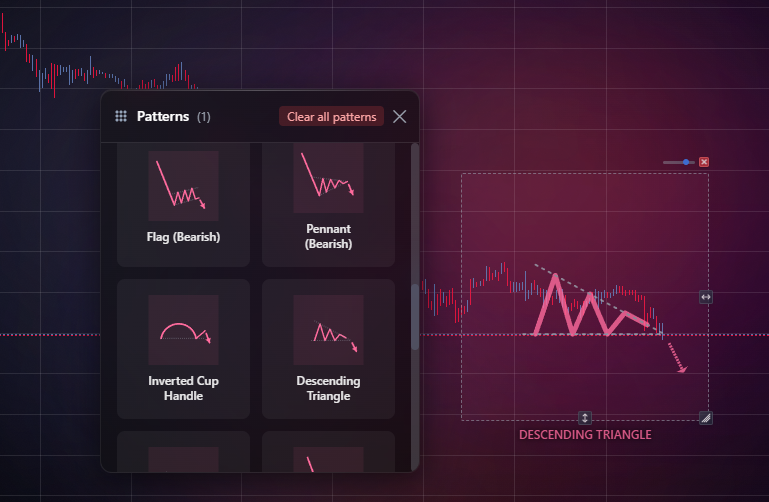 | Toolbar | Top | Timeframe selector, chart type, drawing tools, pattern panel, keyboard shortcuts help. |