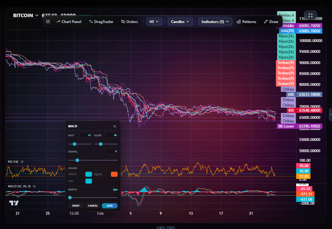 When you maximize the chart to fullscreen, a Chart Panel appears as a compact floating trading panel directly on the chart. It includes all Pro Panel features in a space-efficient layout. The Chart Panel can be dragged anywhere on the chart so it does not obstruct your view. It is ideal for traders who want maximum chart visibility while retaining full trading controls.