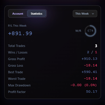 | Statistics Panel | Bottom | Trading metrics by period — win rate, P/L, best/worst trade. |