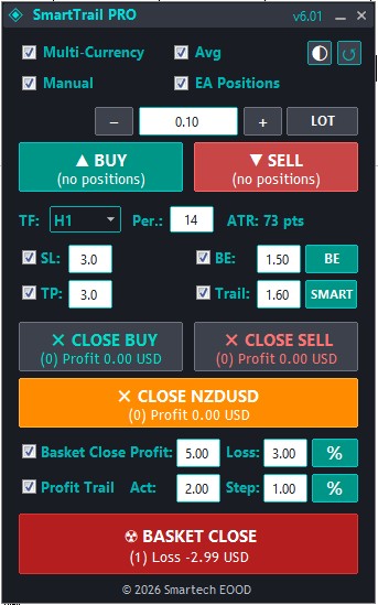 Trading financial instruments involves significant risk. SmartTrail PRO is a trade management assistant and does not guarantee profits. Past performance is not indicative of future results. Always test thoroughly in the Strategy Tester or on a demo account before live application.