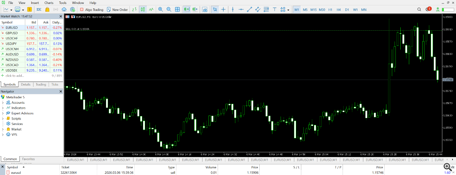 EUR/USD trade from March 6th NFP release – Entry at 1.15906, capturing the downward move after initial volatility