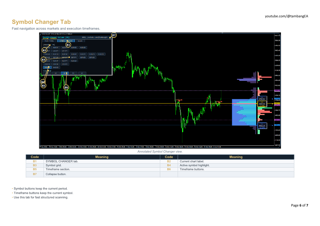 Use the built-in Symbol Changer and Timeframe buttons to scan markets without breaking your workflow.