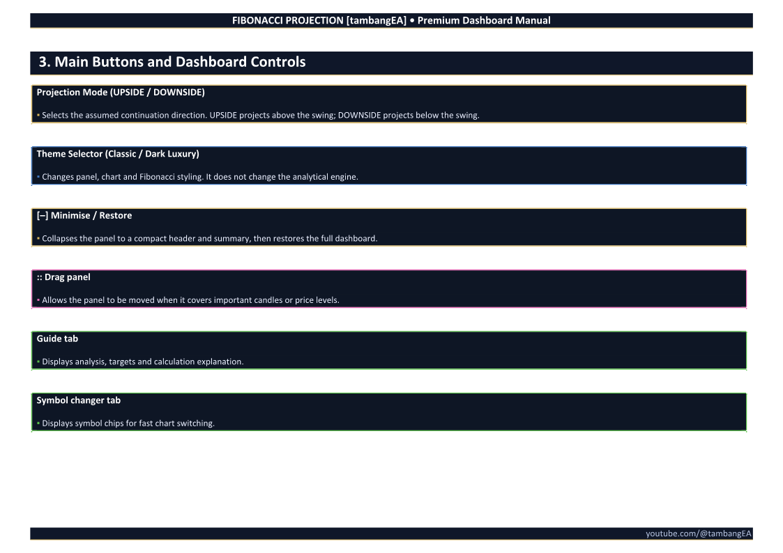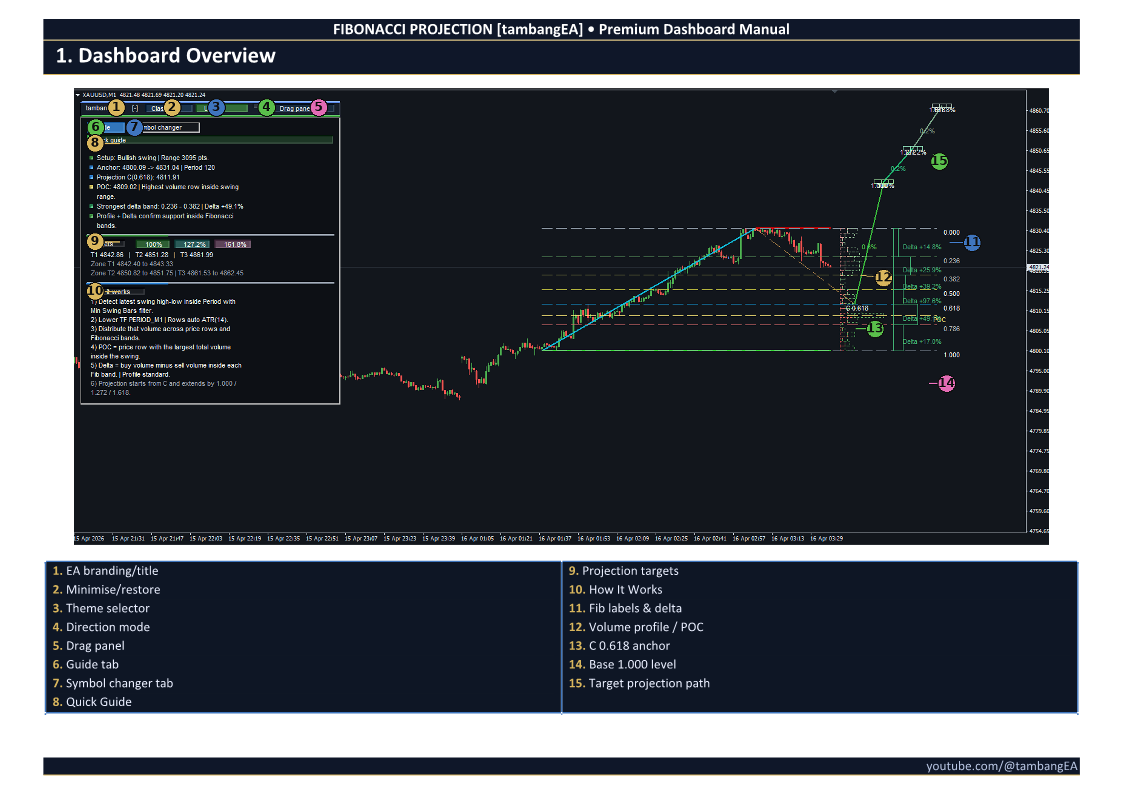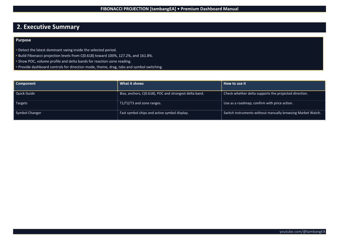 FIBONACCI PROJECTION [tambangEA] is a professional dashboard-based trading analysis tool designed to help traders identify market structure, Fibonacci projection targets, volume reaction zones, and directional continuation areas directly on the chart.