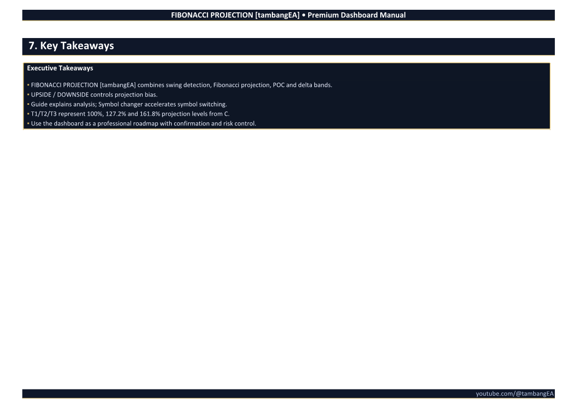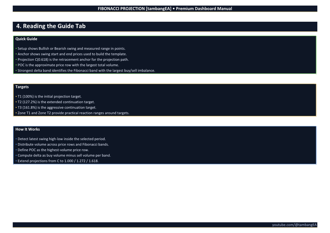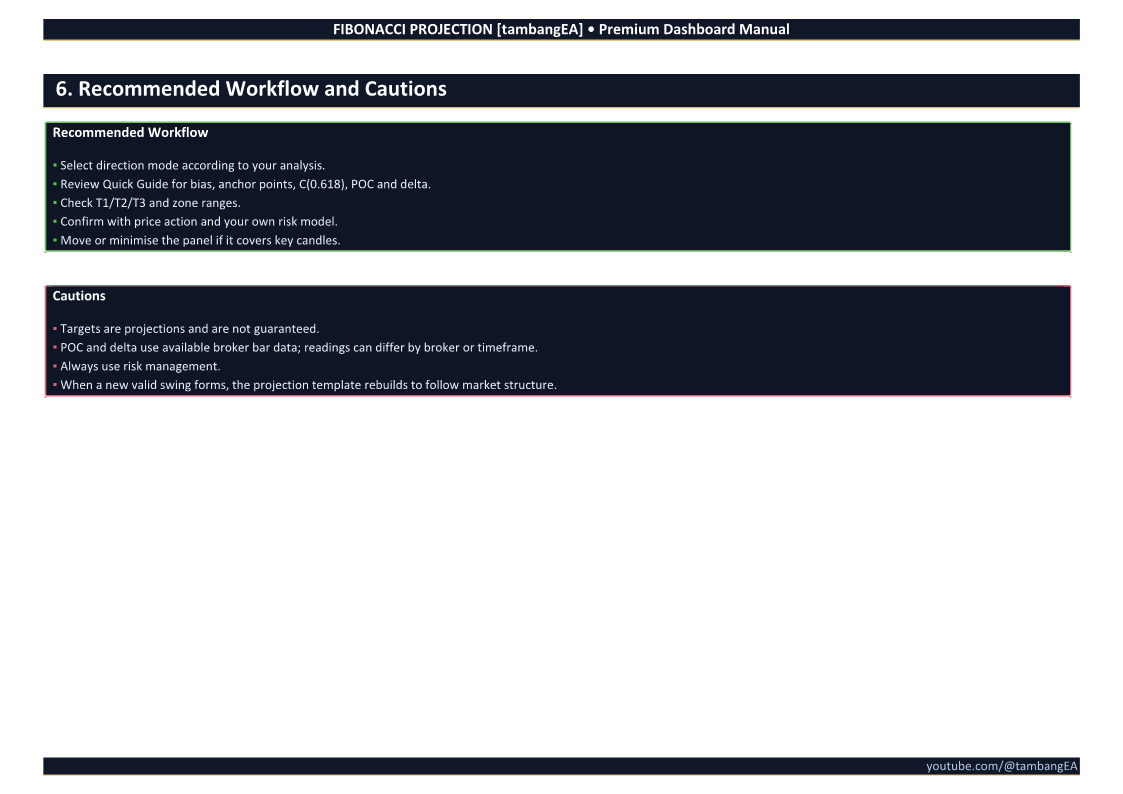 This tool does not guarantee that price will reach any projected target. Fibonacci projection levels are analytical reference zones, not fixed trade signals.