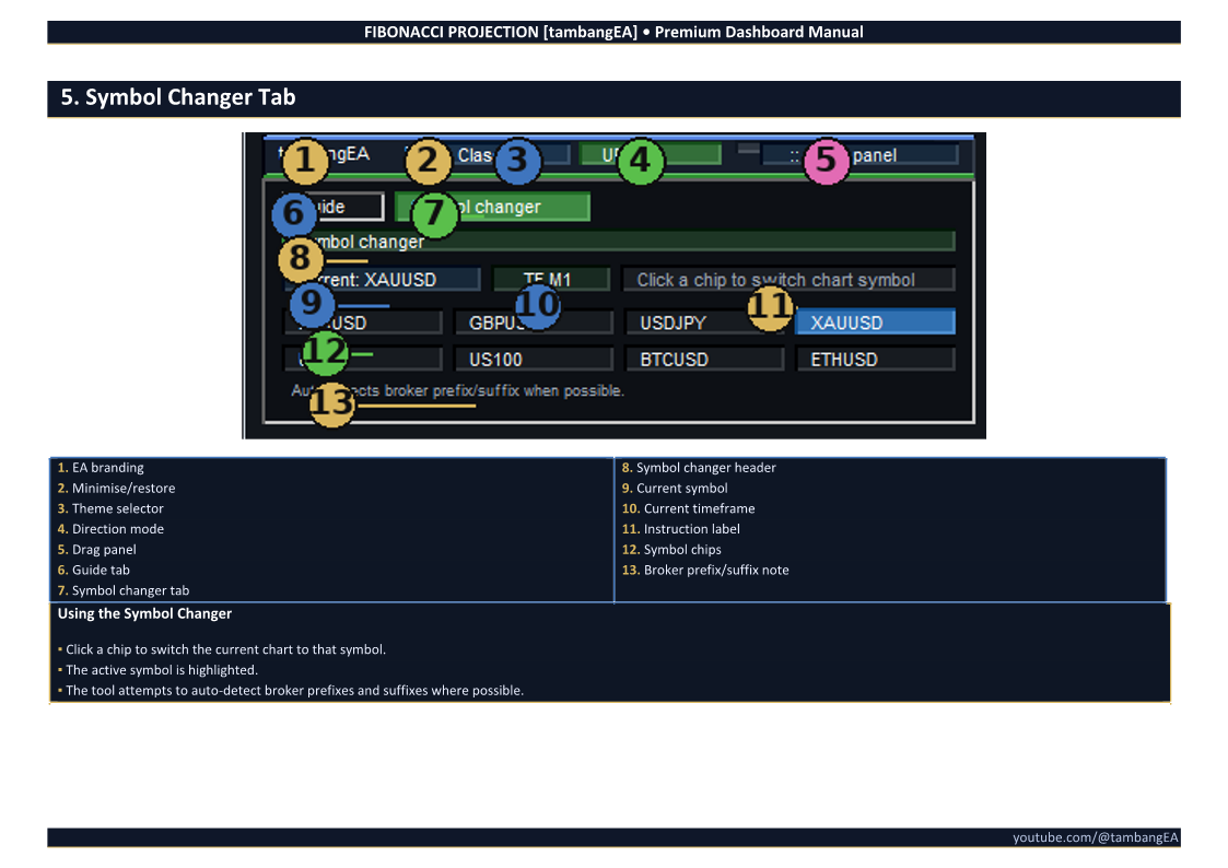 The built-in Symbol Changer tab allows quick switching between common trading instruments directly from the dashboard.