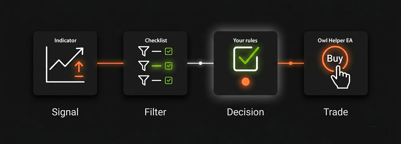 - Owl Helper Expert Advisor helps with execution and trade management. At the same time, the decision to enter always remains with the trader — the system only helps to structure it.