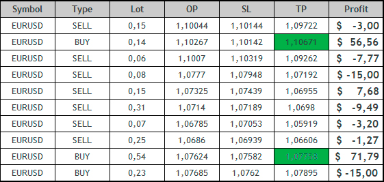 Let’s take one of the average months — May 2023. And one pair — EURUSD. Below is a table of all trades for that period.