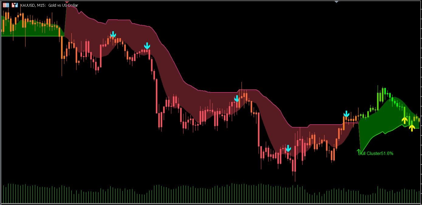 Yellow arrows (▲) indicate strong long entry points. Cyan arrows (▼) indicate strong short entry points. These appear when the cluster consensus shifts.
