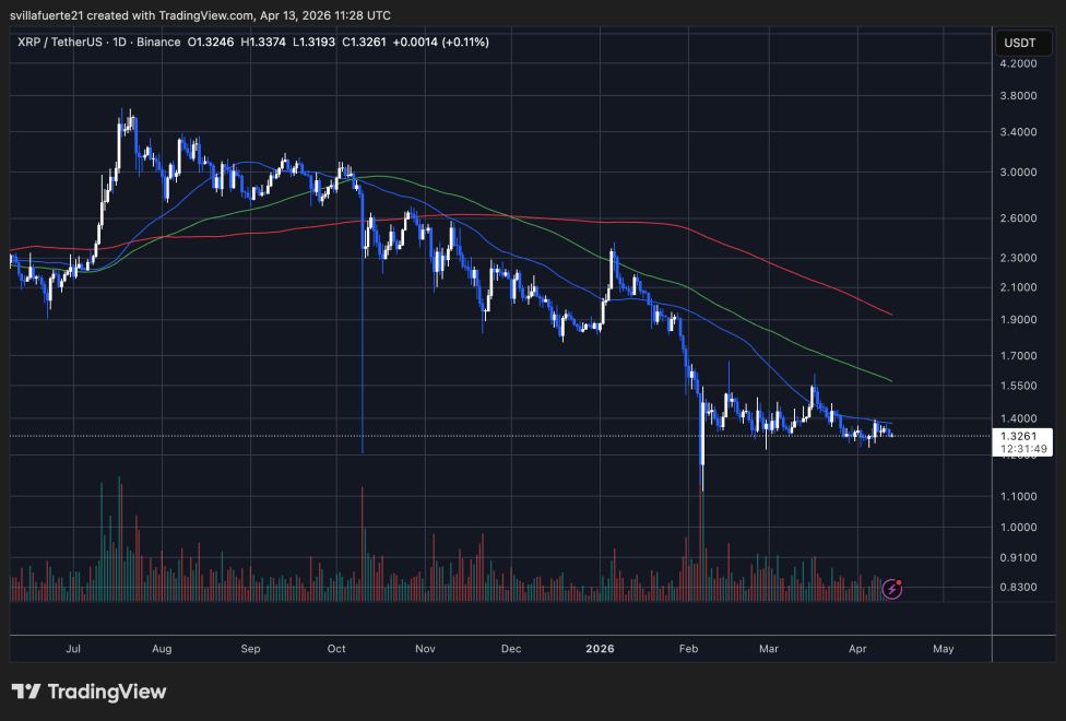 XRP continues to trade just above the $1.30 level, maintaining a narrow consolidation range after the sharp breakdown that defined February’s price action. The chart reflects a clear transition from trending behavior to compression, with price moving sideways between roughly $1.25 and $1.40.