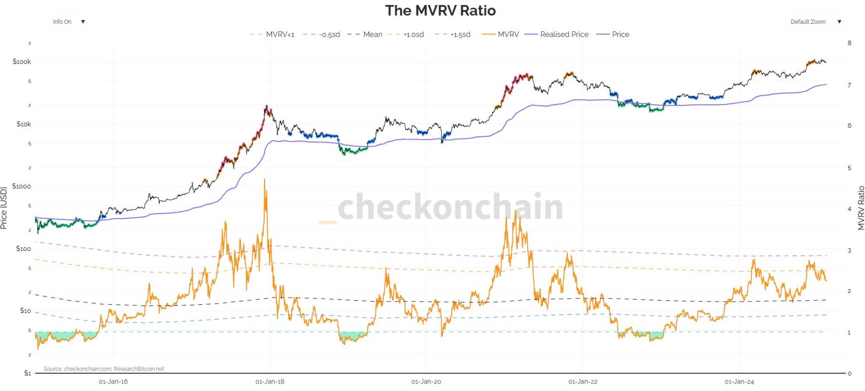 Checkonchain 数据显示,短期持有者(STH)的市场价值与实现价值比率(MVRV)降至 1.05。