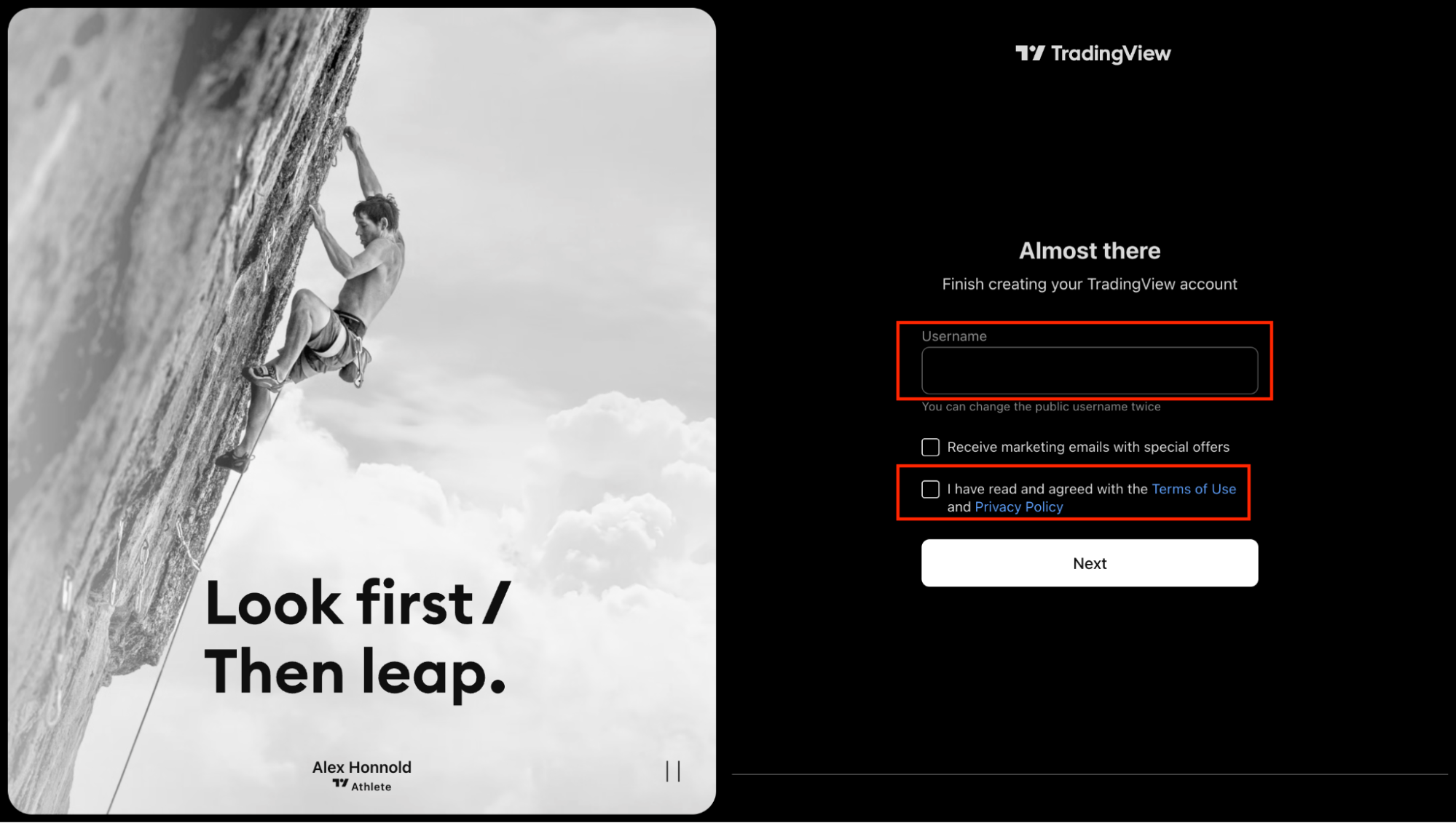 After signing up, select a TradingView username and click on ‘I have read and agreed with the Terms of Use and Privacy Policy’ to complete the creation of your account.