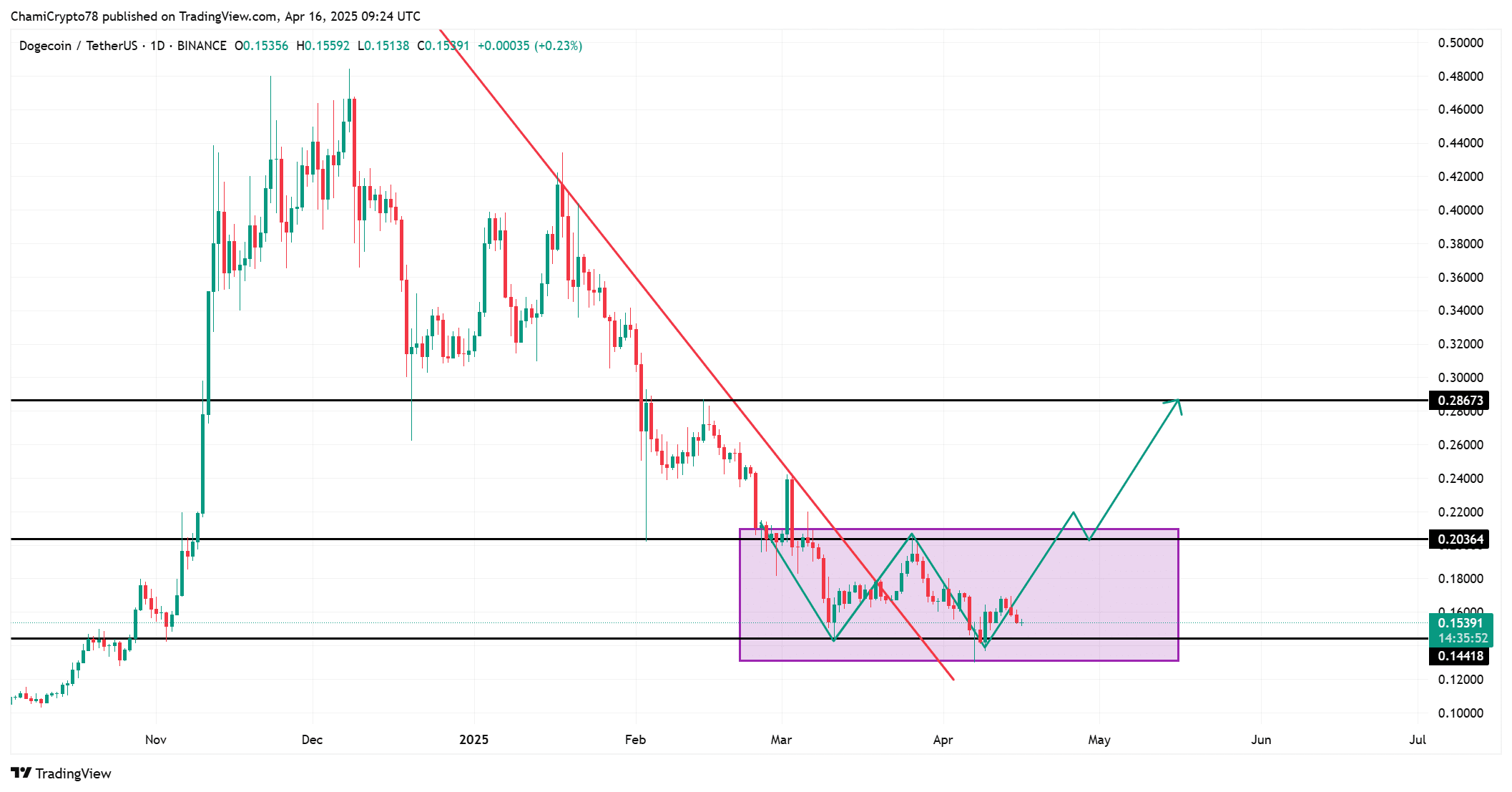 Recently, DOGE broke a downward trendline that had been active since mid-February, signaling a possible trend reversal. Additionally, a double-bottom pattern has formed within this range, strengthening breakout expectations.