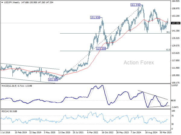In the bigger picture, price actions from 161.94 (2024 high) are seen as a corrective pattern to rise from 102.58 (2021 low). Decisive break of 61.8% retracement of 158.86 to 139.87 at 151.22 will argue that it has already completed with three waves at 139.87. Larger up trend might then be ready to resume through 161.94 high. In case the corrective pattern extends with another fall, strong support is expected from 38.2% retracement of 102.58 to 161.94 at 139.26 to bring rebound.