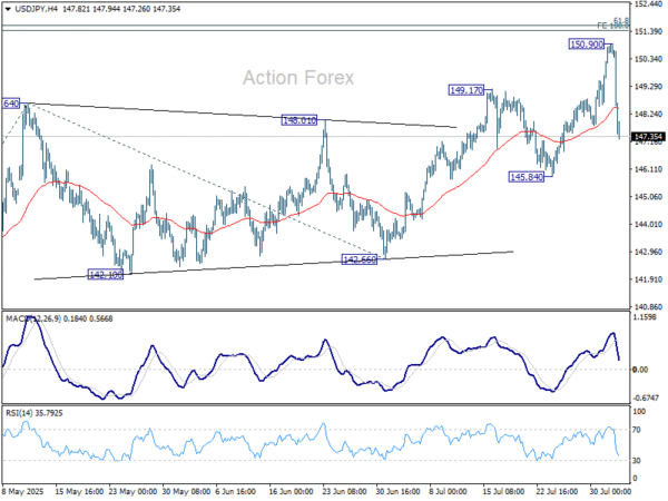 USD/JPY rose further to as high as 150.90 last week but reversed ahead of 100% projection of 139.87 to 148.64 from 142.66 at 151.43. Initial bias stays neutral this week first. On the downside, firm break of 145.84 support will argue that whole rise from 139.87 might have already completed. Deeper fall should then be seen to 142.66 support for confirmation. On the upside, above 150.99 will resume the rebound to 151.22 fibonacci level.