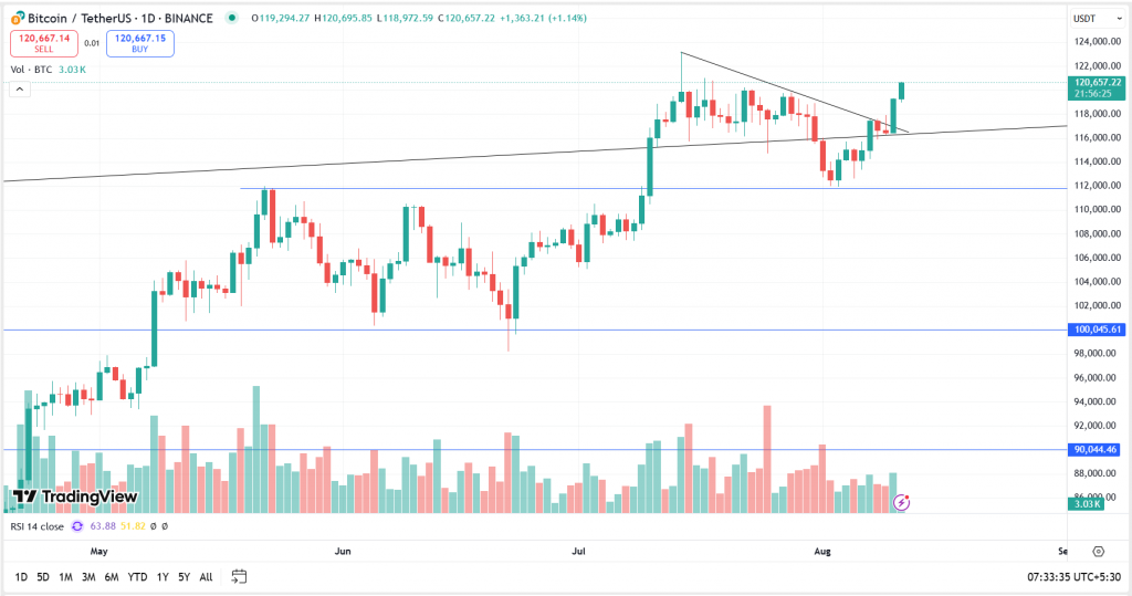 After making an all-time high of $123,218, BTC witnessed some profit booking, and the price corrected by almost 9.5%, dropping to $111,920. Following this move, the asset faced resistance at the downsloping trendline and traded in a ‘Descending Triangle’ pattern. BTC eventually broke out of this descending triangle, which had been forming for several days. The breakout occurred with strong bullish momentum and a significant green candle accompanied by high volumes. The asset has strong resistance at $125,000, and to rally further, it needs to break, close, and sustain above this level.