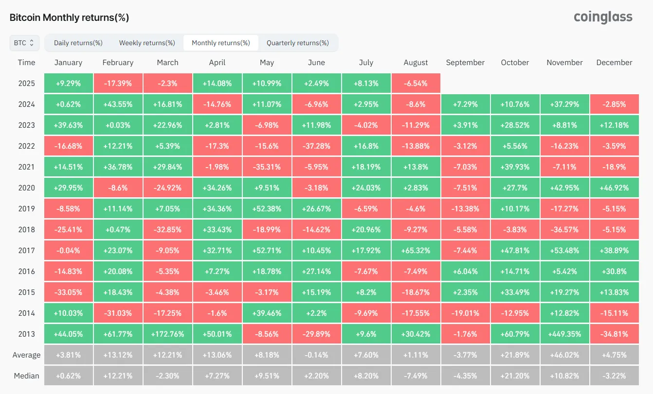 The phenomenon known as “Red September,” or “The September Effect,” has haunted markets for nearly a century. The S&P 500 has averaged negative returns in September since 1928, making it the index’s only consistently negative month. Bitcoin’s track record is worse—the cryptocurrency has fallen an average of 3.77% each September since 2013, crashing eight times according to data from Coinglass.