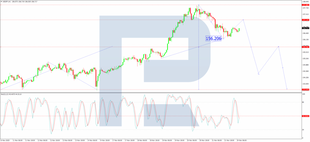On the H1 chart, the pair completed a downward wave to 156.20. We are now observing a corrective phase for this move, with an initial target set at 157.13. Upon completion of this upward correction, we expect the next leg of the downtrend to develop, targeting 154.44. The Stochastic oscillator confirms this near-term view. Its signal line is above 50 and rising towards 80, indicating that short-term buying pressure is driving the correction before the larger bearish trend reasserts itself.