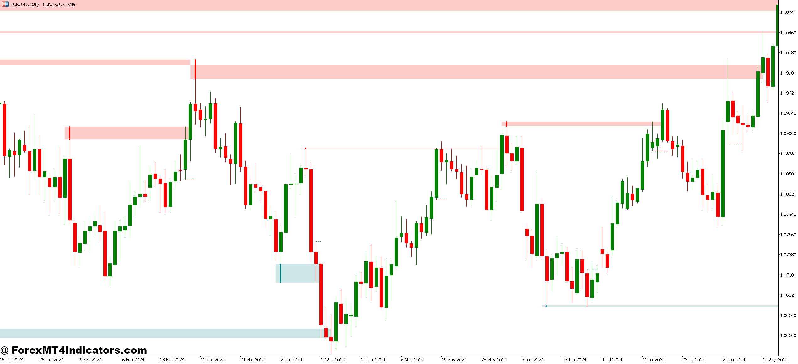 - Price spikes above the liquidity zone, then reverses – Short when EUR/USD wicks 10-15 pips through a green zone onthe 1-hour chart, then closes back below it within two candles.