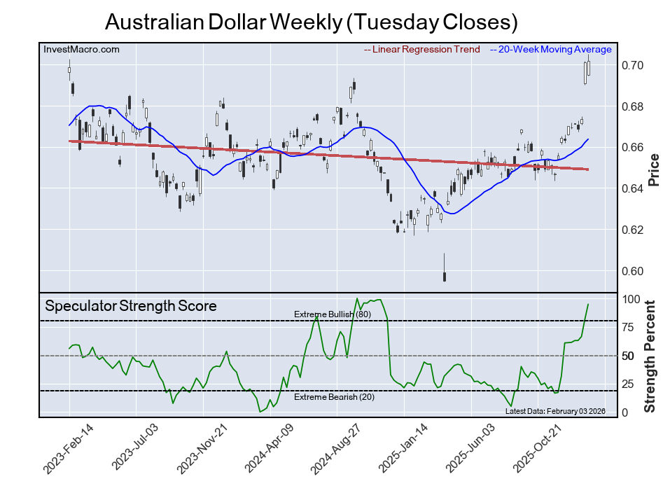 The six-week trend for the speculator strength score was a fall by -11 percentage points this week while the speculator position was -172,310 net contracts this week with a decrease by -8,704 contracts in the weekly speculator bets.