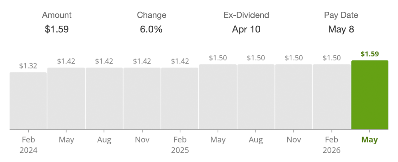 Dynamics (GD) increased its dividend by 6%, from $1.50 to $1.59 per share.