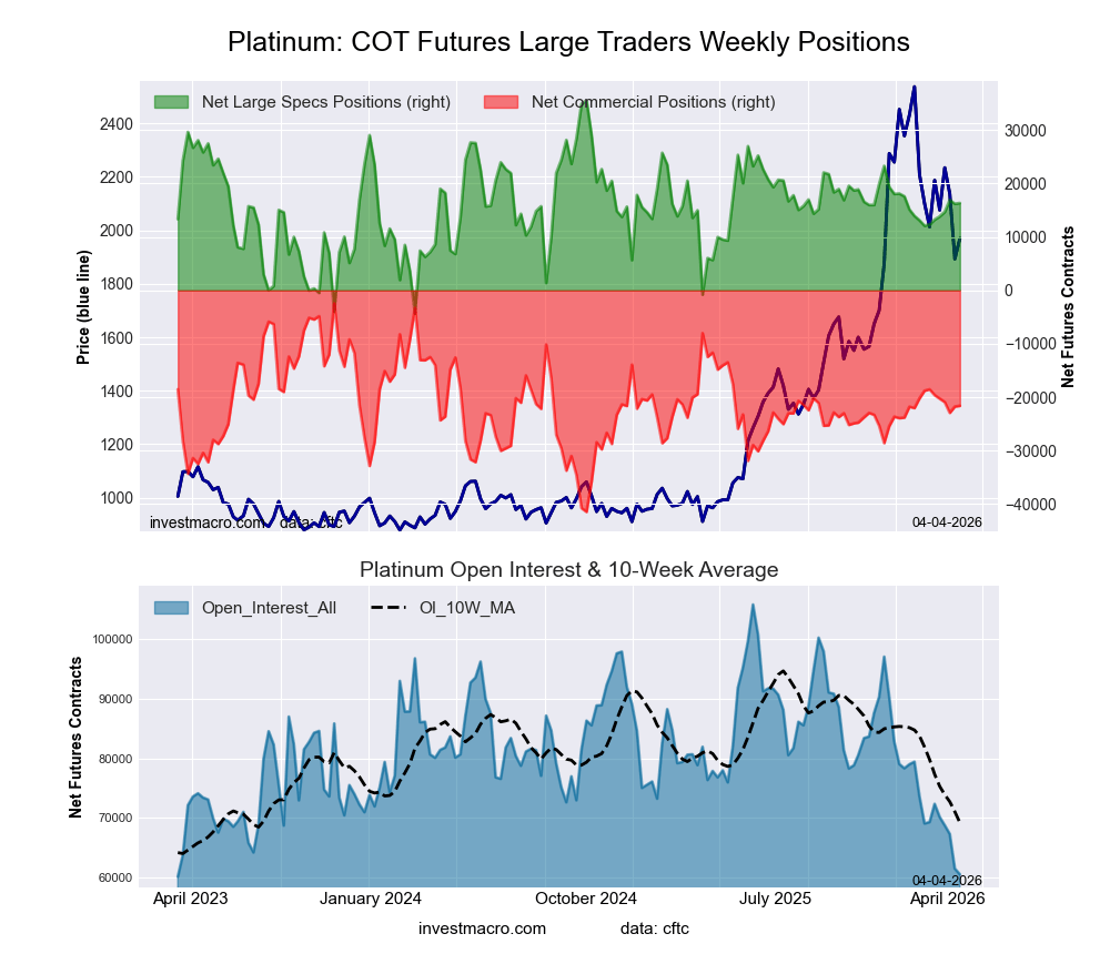 The Platinum Futures large speculator standing this week reached a net position of 16,337 contracts in the data reported through Tuesday. This was a weekly lift of 139 contracts from the previous week which had a total of 16,198 net contracts.