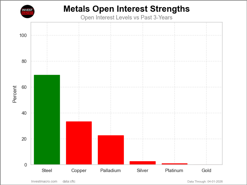 COT Strength Scores (a normalized measure of Speculator positions over a 3-Year range, from 0 to 100 where above 80 is Extreme-Bullish and below 20 is Extreme-Bearish) showed that Palladium (85 percent) and Steel (83 percent) lead the metals markets this week.
