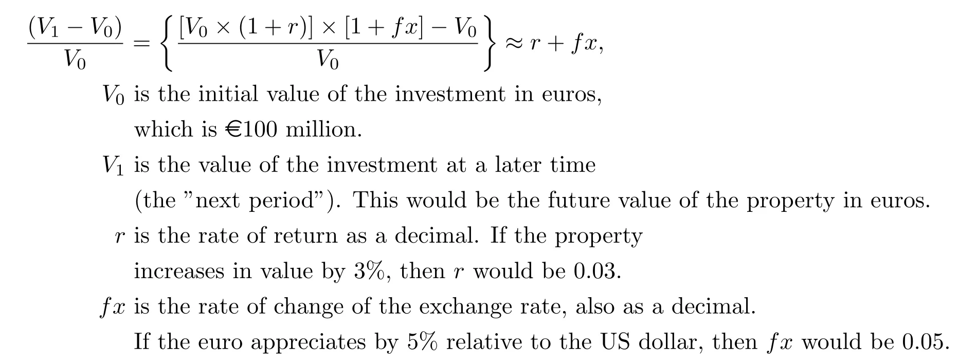 This equation estimates the return an investor can expect from an investment. It takes into account the change in the asset’s value in local currency (r) and the change in the exchange rate (f𝑥).