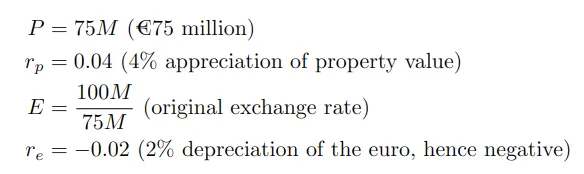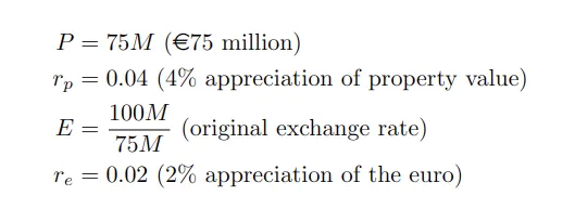 Let’s assume a US investor is interested in a European property valued at €100 million. In this scenario, the investor is concerned with the changes in the property’s value and the Euro’s value against the US dollar. The European property is appreciated from €100 million to €103 million.