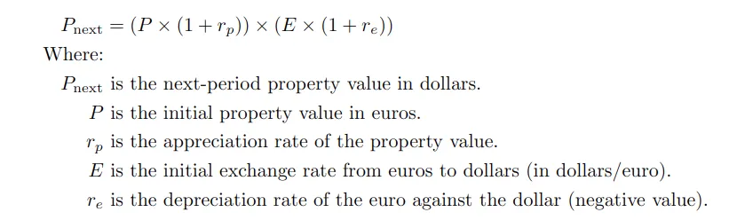 Remember the equation above, which helps us understand the combined effect of the property’s value change and the currency exchange rate on your investment’s overall value.