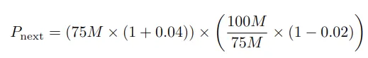 P_next = (75 × (1 + 0.04)) × ((100÷75))×(1+0.02) = $106.08M