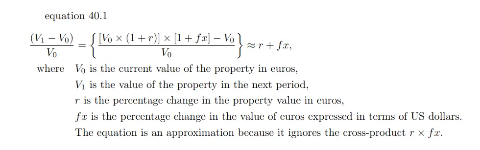 So picture this: you’ve got a property where the local currency, say the Euro, is taking a nosedive compared to the US dollar. In finance, we’d expect the return of the property (that’s our friend “r” in Equation 40.1) to mirror this.