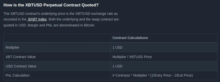 Now, you may wonder what that return profile looks like. Here is the XBTUSD perpetual contract specification. We see that the USD contract value is 1 USD.