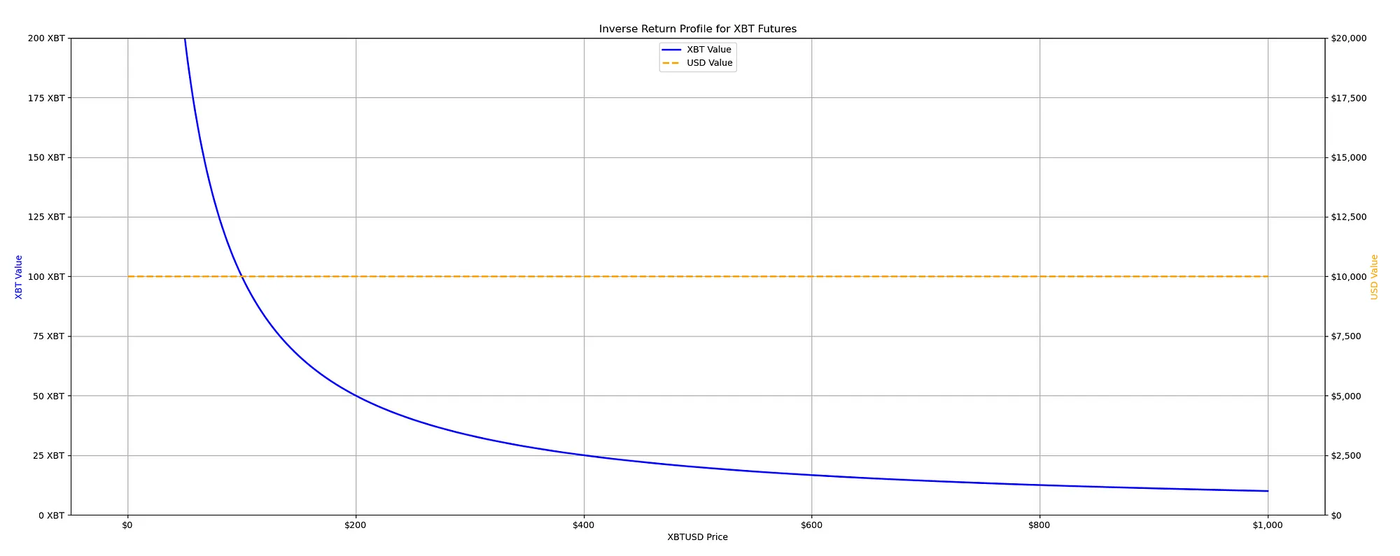 However, if the price of Bitcoin goes down, the graph shows that the Bitcoin value of our contracts could increase without a limit. This is because, mathematically, as you divide by a smaller and smaller number (the price of Bitcoin, which is getting lower), the results get larger and larger.