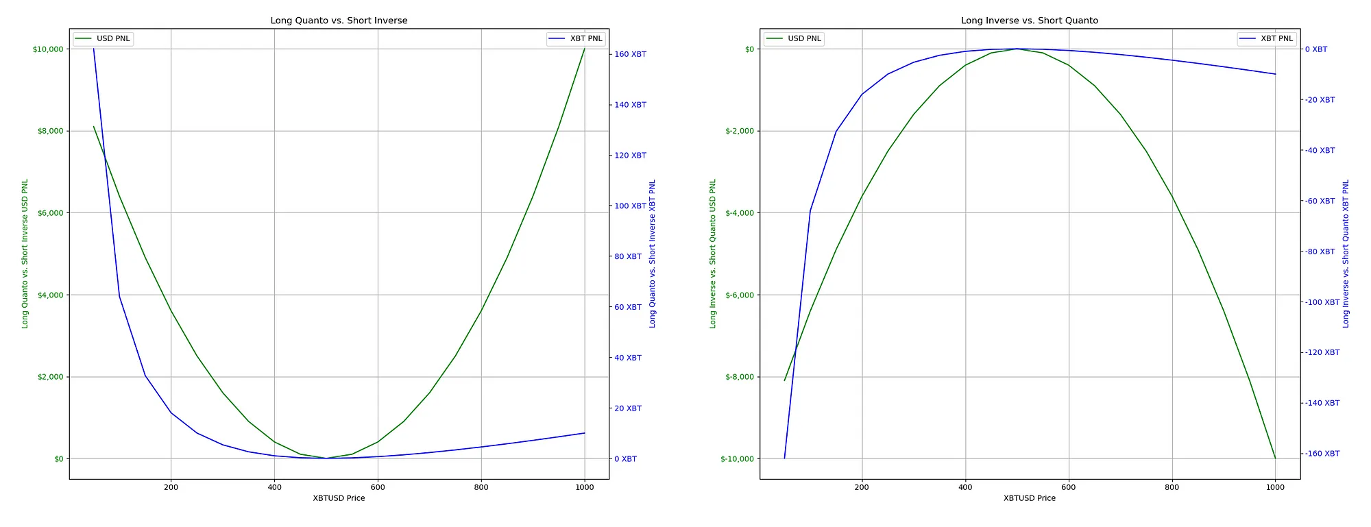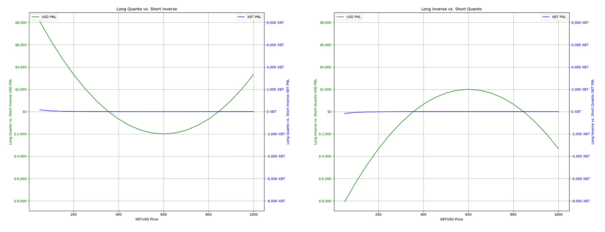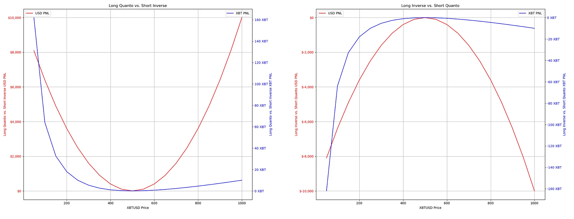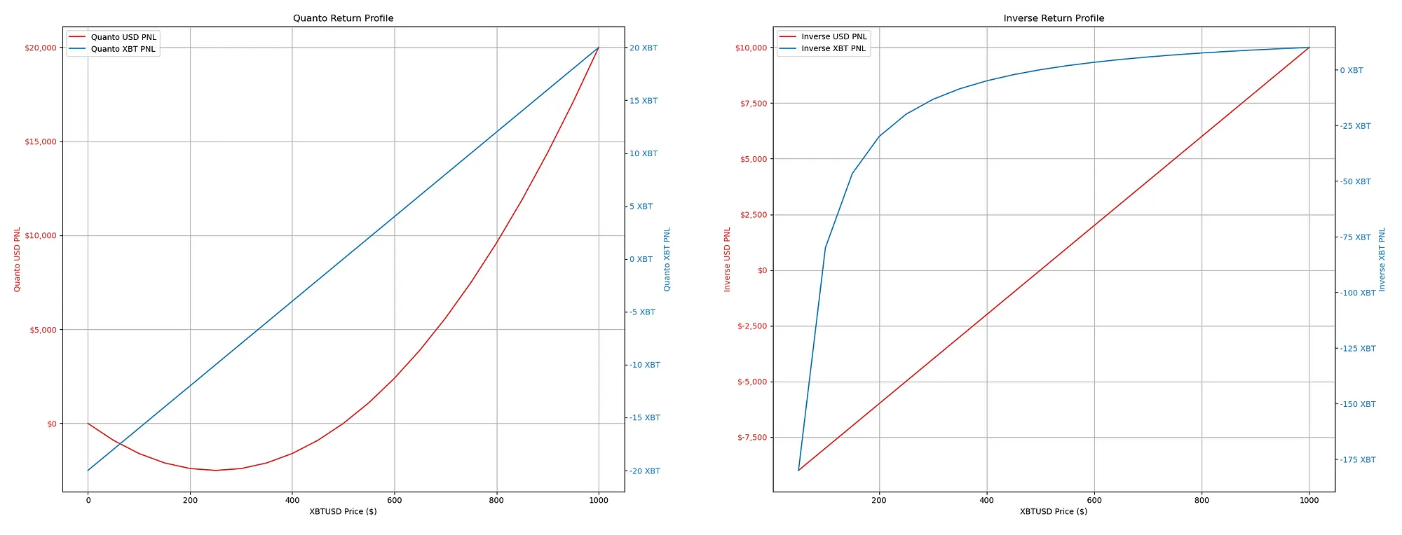 For both contract types, we see the PNL in Bitcoin and US dollar terms over a range of Bitcoin prices from $0 to $1000. The Profit and Loss (PNL) for both types of contracts is visually illustrated in terms of Bitcoin and US dollar.