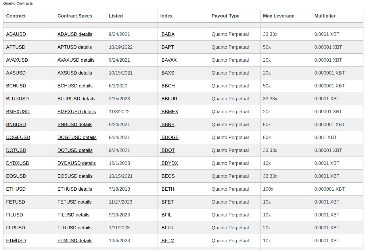 BitMEX Quanto futures list including altcoins can be found here.