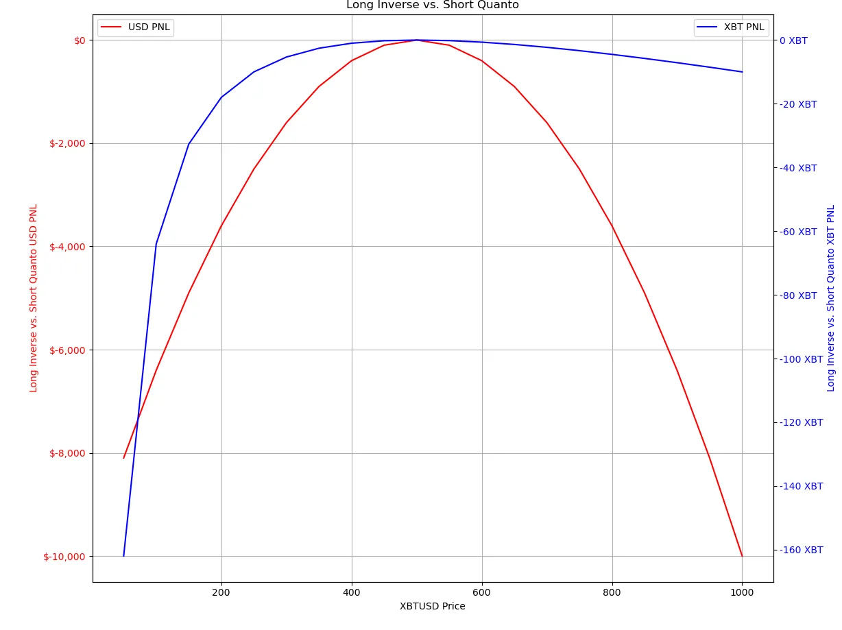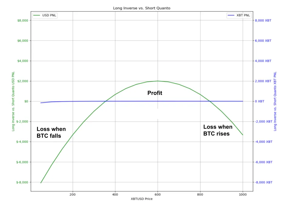 In a “Long Quanto vs. Short Inverse” setup, we are entering a derivatives position sensitive to Bitcoin’s price movements and the corresponding impact on the USD payout, which depends on both the BTC price and its volatility.