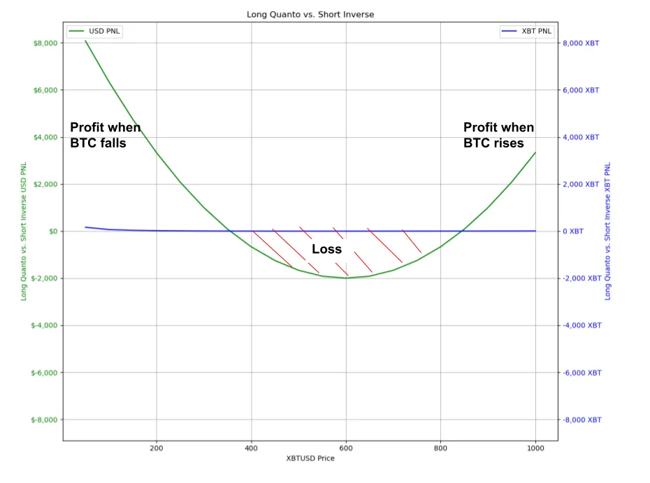 If we were to take the opposite position, selling volatility by going “Long inverse and short quanto,” we would collect a premium similar to an option seller. We would profit as long as the market stays within the range, but the risk is that if the BTC price moves beyond this range, our losses increase in a non-linear fashion due to the short position in the quanto contract.