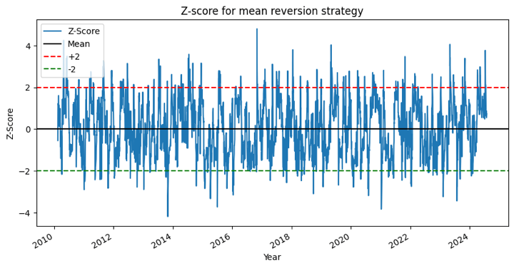 The absolute ratio isn’t very useful in statistical terms. It can be observed through the above ratio graph that it does not look like it moves around a stable mean. We need to normalise the ratio. This is done using z-score.