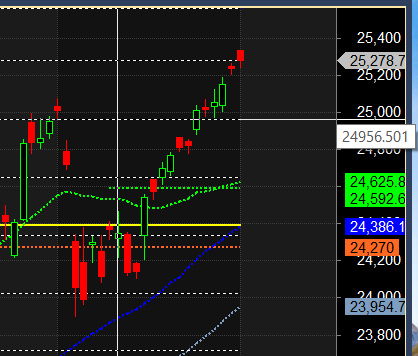 Price continue to move higher with Nifty rising for 12 days in a row. Record of its kind. Till Bulls are holding 25078 price can rally towards 25300.