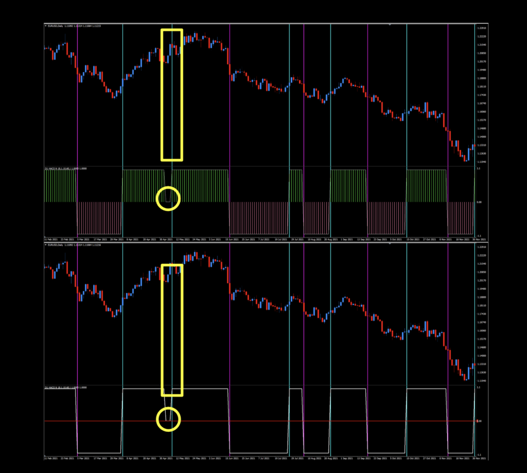 Another cool feature of this indicator is that it prints the signal as a vertical line for you, meaning there’s no guessing. So you can tweak this indicator to have multiple visual appearances. You can even remove everything except the alert lines which, coincidently, are the long and short signals.