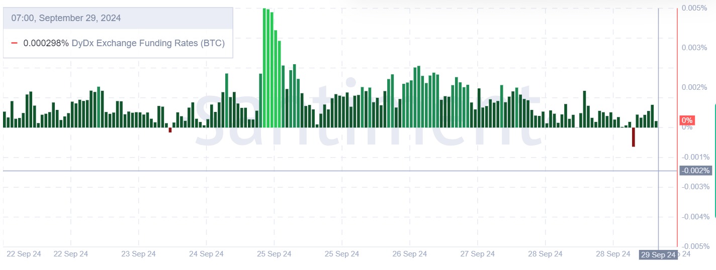 Finally, Bitcoin’s DyDx exchange funding rate has remained positive over the past week. A positive DyDx exchange funding rate suggests long position holders are paying those taking shorts to hold their position.