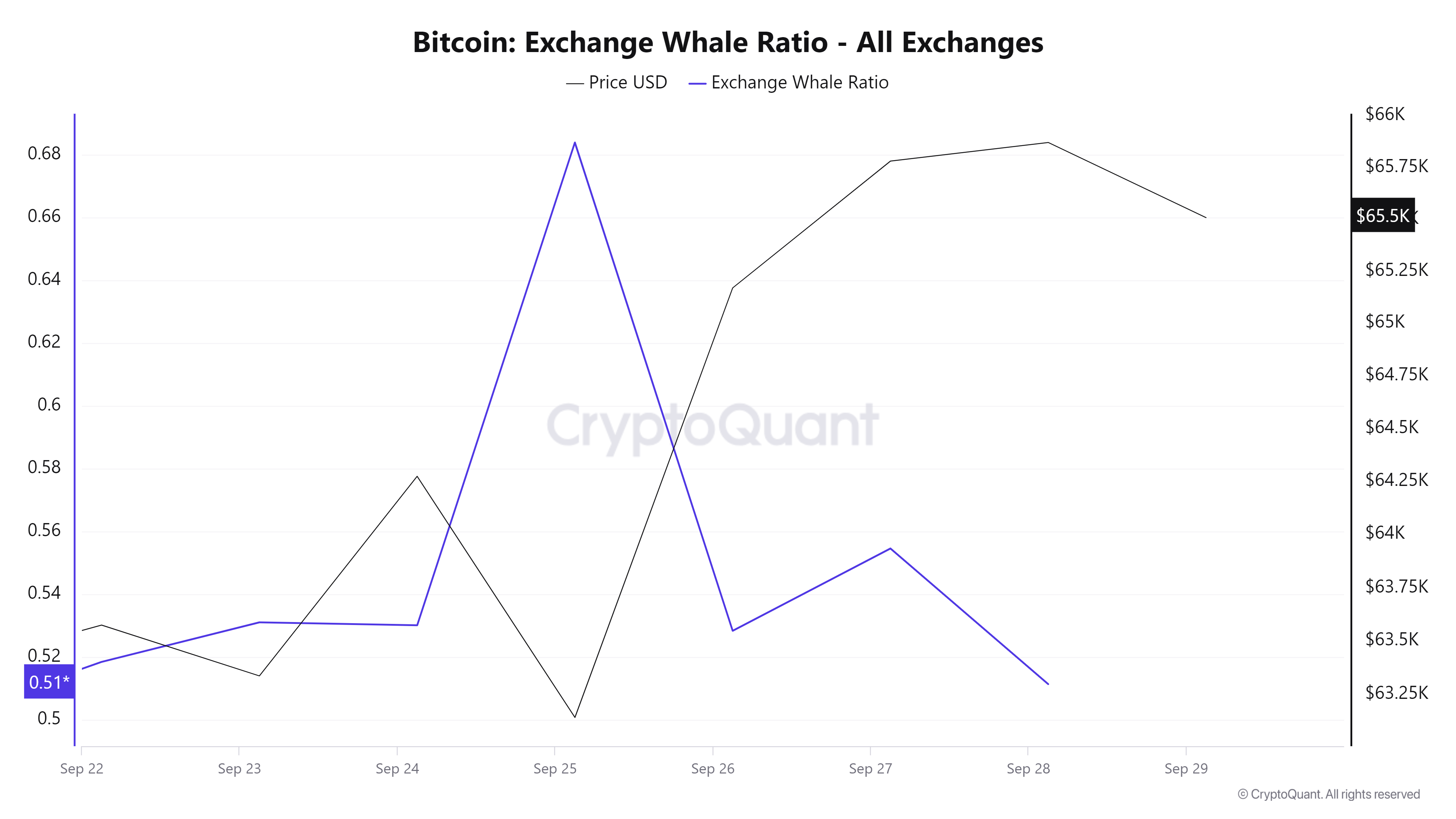 For example, the Exchange whale ratio has declined from a high of 0.68 to 0.511 at press time. This decline suggests that whales are moving their BT off exchanges into private wallets.