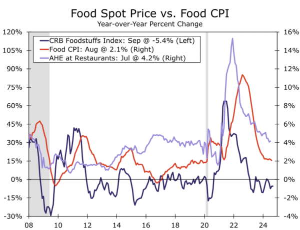 The pullback in gasoline prices over the past year has been one key factor in driving the headline lower. We estimate energy goods prices fell a little more than 4% in September and 15% since this time last year. Food inflation has also quieted down amid tamer commodity prices, more price-sensitive shoppers and slower wage growth at restaurants and grocery stores (Figure 1). We look for prices for food at home and away from home to have advanced 0.1% and 0.3%, respectively, in September, which would result in the year-over-year pace of the overall food index slipping to 2.0% from 3.7% last September and more than 11% at its recent peak.
